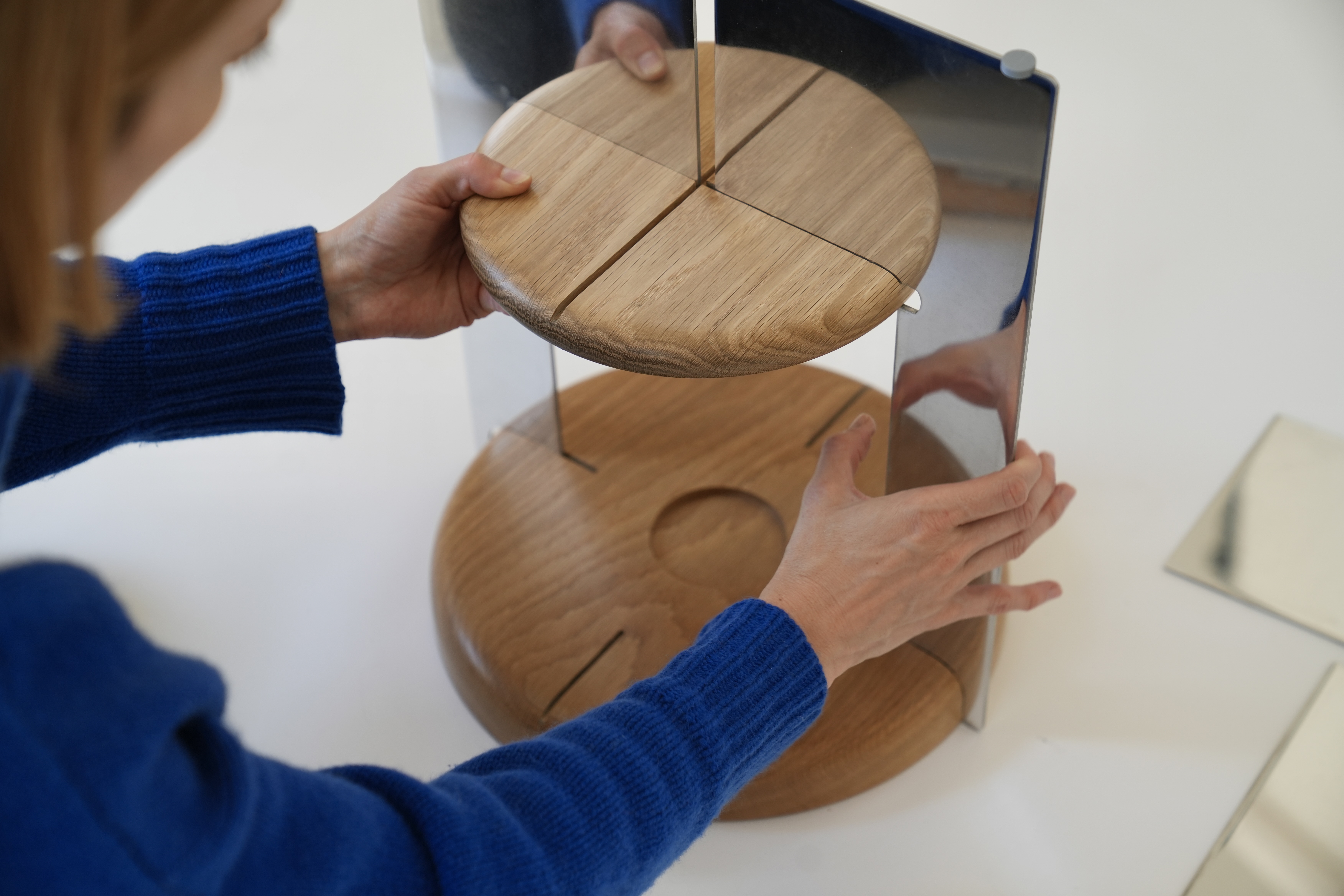 The design of the Slot Side Table derives from the joinery of flat pieces that form a rigid dimensional structure once assembled. Laser-cut aluminum legs serve as structural elements, sliding directly into slots on the undersides of the two turned solid oak shelves—without the need for screws or glue. The legs are polished to a mirror finish, creating the illusion of a floating shelf while seamlessly blending into the room.
